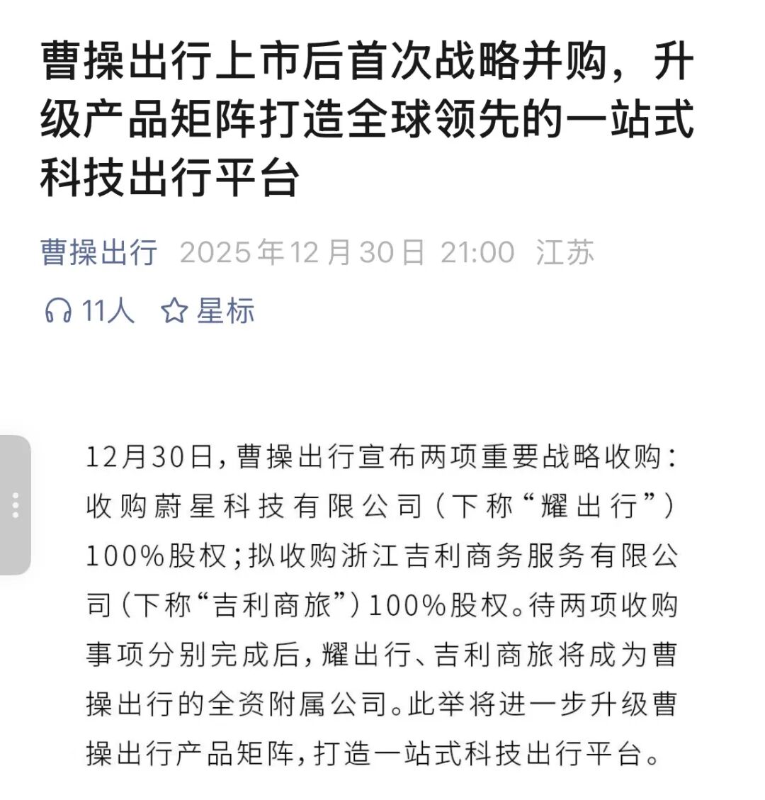 12月30日,曹操出行告示两项热切政策收购,以现款对价2.25亿元全面收购蔚星科技有限公司(下称“耀出行”)100%股权,并以6500万元拟收购浙江放心商务处事有限公司(下称“放心商旅”)100%股权,两项往来蓄意近3亿元。待往来完成后,耀出行和放心商旅将成为曹操出行的全资从属公司。