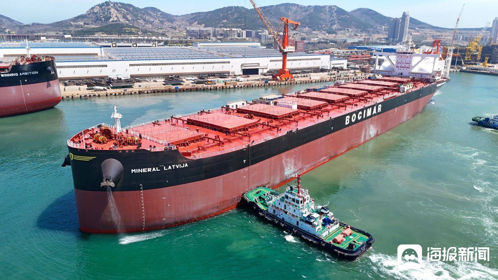 《21万吨绿色燃料船舶出发海试》2026年4月13日,中国船舶集团青岛北海造船有限公司分娩现场一片劳苦。一艘21万吨绿色燃料船舶在办完手续后,出海试航。据了解,北海造船现在在建船舶25艘,手执订单达90余艘,其中绿色燃料船舶占比超九成,部分船舶交船期已排至2030年。张进刚 摄